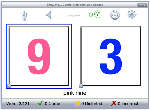 The Correct, Distorted, and Incorrect buttons should be used for child specific targets and are provided as a counting tool for the SLP. The SLP can determine what target goal is being scored for each trial. For example, for Child 1 you might want to score “attempts to imitate single words” as Correct, and score “no attempt to imitate” as Incorrect. The scoring for Child 2 may be, “novel sentence generation for target word” is Correct and “incomplete or no sentence generated” is Incorrect. You can record and score as many times as you wish for each word.