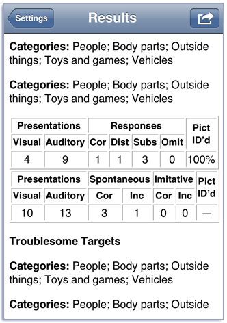 The Results tab shows the results for the day. For each category, the app collects data on the total Visual Presentations (number of screens viewed), taps on the Correct and Incorrect buttons, and the total Auditory Presentations (the sum of the taps on the picture, and the Show Me and Target buttons). It also reports the percent correct responses to the “Show Me” prompt, if the checkboxes were turned on. A new results file is created when you change the “Sign In” name or when the day changes.