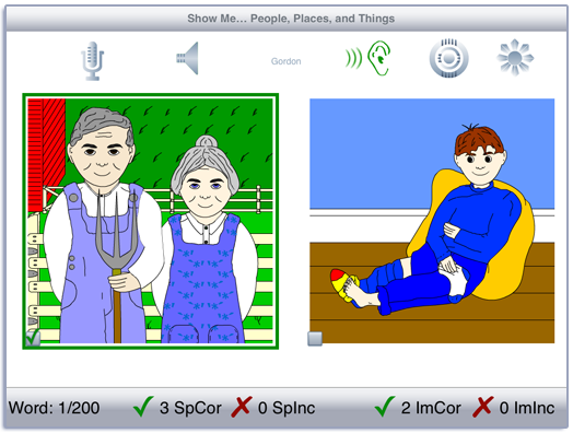 Tap the Play button to start. A random pair of pictures (target and foil) are displayed on the screen. Swipe right-to-left to move to the next pair. You will hear the prompt “Show Me” and the target sentence. Touch each picture and listen as the word is pronounced. Touch the other picture and listen to it. If “Show Cor/Inc Boxes” is turned on in the Options there will be a small checkbox in the bottom left-hand corner that you can use for selecting the “Show Me” target. Touch the checkbox and it will have a check in it if the picture is the target and an x if the picture is the foil. Touch the Target button (it looks like an archery target) to see which word you were prompted to “Show Me”. Tap the “Prompt” button (it looks like an ear) to hear the “Show Me” prompt again.