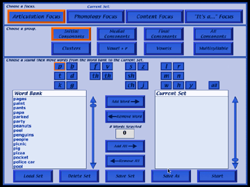 Now that the words for this session's practice have been selected, the teacher can save the set for a specific client using the Save As button. When the Save As button is clicked, a text box appears asking for a name for the set. If the teacher decides to make changes to this set, the changes can be saved by clicking on the Save Set button. The teacher can now select a set for another client by removing the words from the current set box, choosing another list of stimulus words, adding them to the current set box, and saving them as the name of the second client. The new set will automatically become the current set, and the games will play with the words in the current set. To see whose set is the current set, look at the top of the focus choice page where the name of the current set is displayed. To change the current set, click on the Load Set button to see a list of all saved sets. Click on the name of the desired set, then click Load. The chosen set name will appear at the top of the page as the new current set. Delete sets by clicking on the Delete Set button. It's now time to start playing Artic Games & More by clicking on the Start button.
