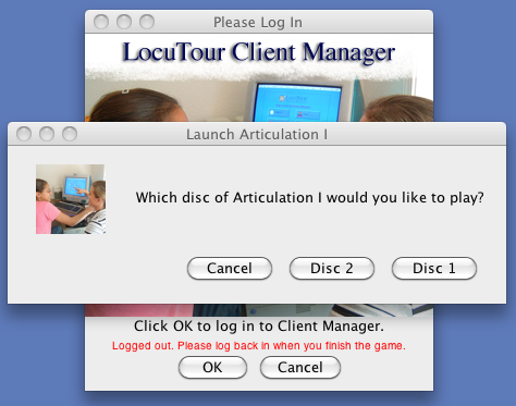 Client Manager needs to know where each LocuTour game is located on your hard disk in order to launch the game. Normally, you add the game from the Launch button and then Client Manager can find it. It’s a little different for Articulation I. Artic I is a two-disc set and both applications must be in the same folder (or on the Desktop) for Client Manager to find them. If you let Client Manager know where Disc 1 is located, it will find Disc 2 when you run Client Manager. Follow the steps above for Speech Visualization except look for the folder with the Articulation 1 application.
